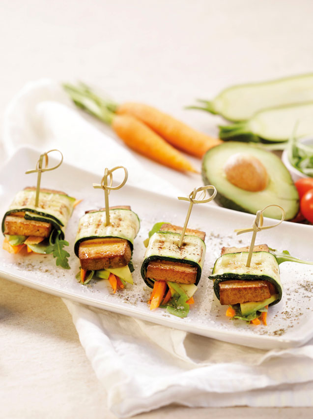 3. Weź plasterek cukinii, ułóż na początku marchewkę, awokado, liście rukoli, a na wierzch połóż tofu. Cukinię zwiń w rulonik i nabij na wykałaczkę.